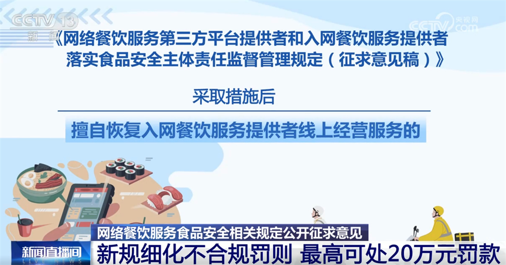 收罗看法稿明白“一证一店”的运营模式,入网餐饮办事供给者不得利用统一运营天分正在统一平台开设多家网店。平台供给者对入网餐饮办事供给者利用统一运营天分反复申请入网的行为该当予以。按照收罗看法稿,平台收到市场监视办理部分关于入网餐饮办事供给者违法违规行为消息等传递未采纳响应办法的;采纳办法后私行恢复入网餐饮办事供给者线上运营办事的;以及未将入网餐饮办事供给者运营天分取省级市场监视办理部分从体天分消息进行校验比对等行为将面对五万元以上二十万元以下罚款。