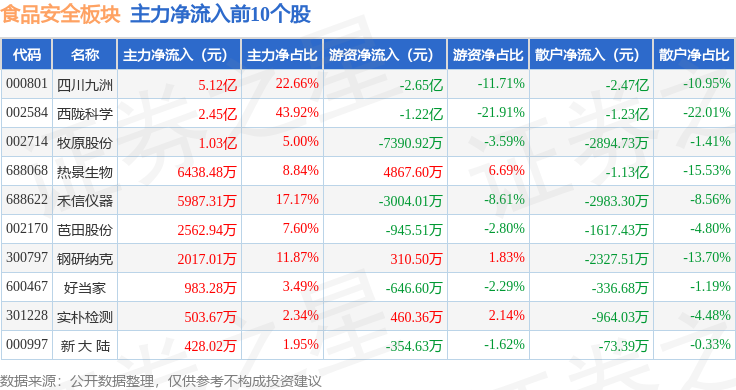 证券之星动静,12月12日食物平安板块较上一买卖日上涨1。78%,西陇科学领涨。当日上证指数报收于3889。35,上涨0。84%。食物平安板块个股涨跌见下表:从资金流向上来看,当日食物平安板块从力资金净流入6。92亿元,逛资资金净流出5。03亿元,散户资金净流出1。89亿元。食物平安板块个股资金流向见下表:以上内容为证券之星据息拾掇,由AI算法生成(网信算备240019号),不形成投资。前往搜狐。